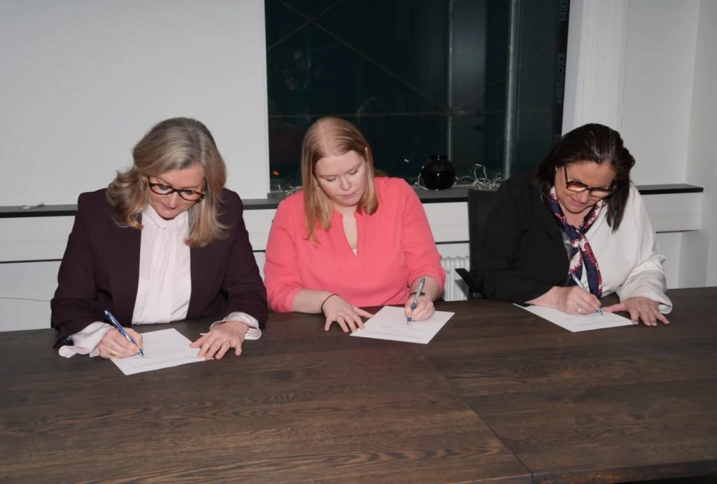 Á myndunum má m.a. sjá Ingu Sæland, félags- og húsnæðismálaráðherra, Ölmu Möller, heilbrigðisráðherra, og Svövu Arnardóttur formann Geðhjálpar skrifa undir samninginn.